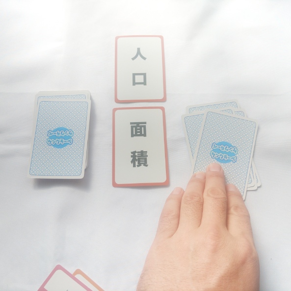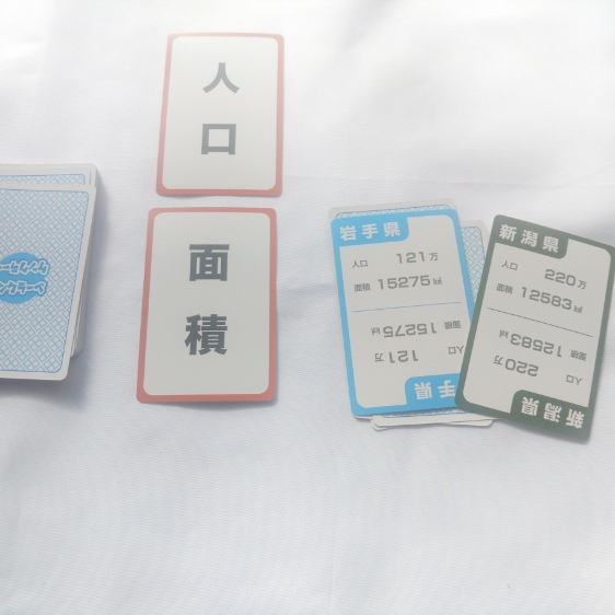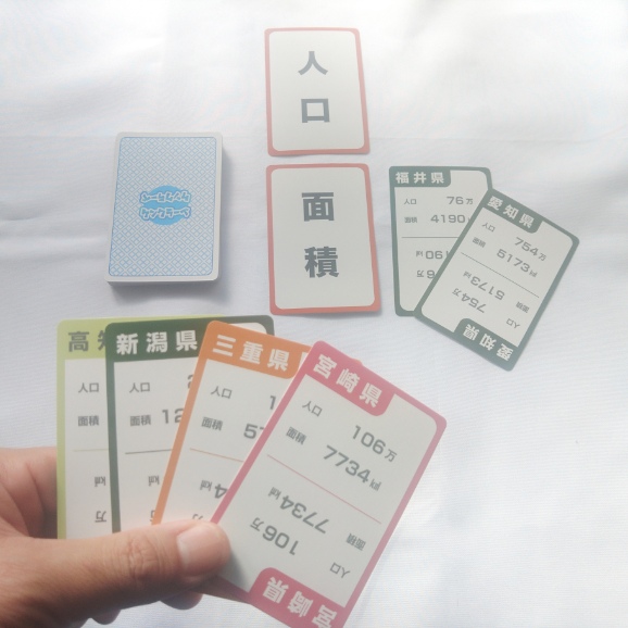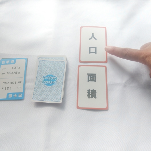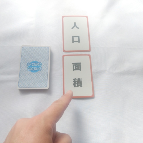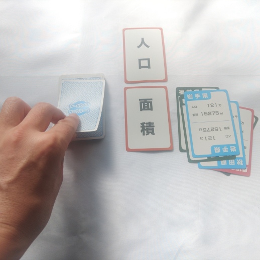 スタートプレイヤーはジャンル(面積か人口)を選択してから、手札の都道府県カードを「ウラ向き」で場に出します。
