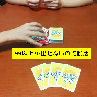 手札のカードのどれを出しても数字の合計数が99以上になるプレイヤーはゲームから脱落。